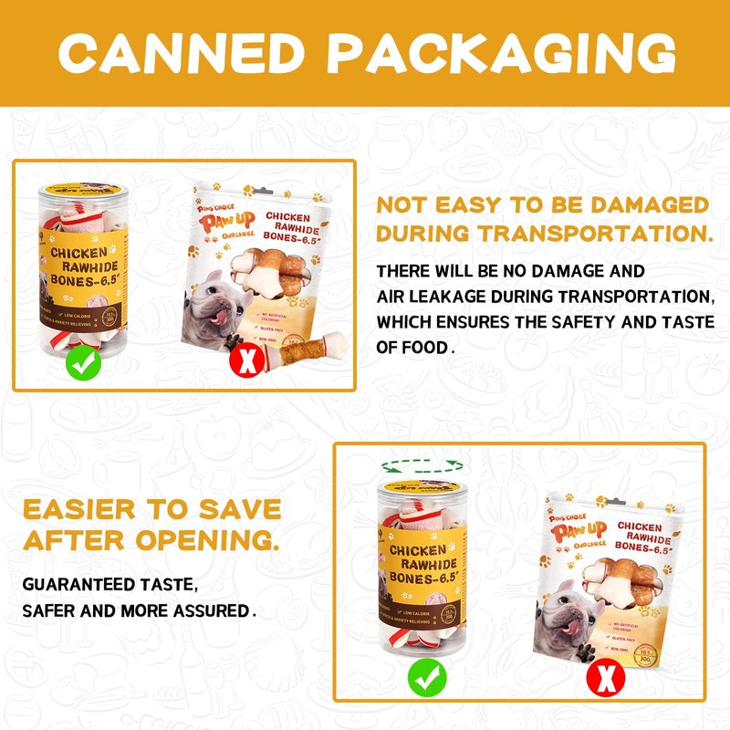 PAWUP is a brand that processes high-quality premium nutritious pet treats, has many years of treats processing experience. PAWUP provides the highest quality products in strict compliance with local food safety standards. We provide high-quality products that serve all consumers in the United States and Europe. All products are composed of 100% pure natural raw materials, we also carry out a series of rigorous testing after processing into the product. We always maintain our high standards for products. Composition Rawhide Knot 75% Chicken 18% Vegetable glycerin 2% Peanut Protein 2% Tapioca starch 1% Sorbitol 1% Taurine 1% Guaranteed Analysis moisture:≤18% ash:≤3.0% protein:≥80% fat:≤1.8% fiber:≤1.0%