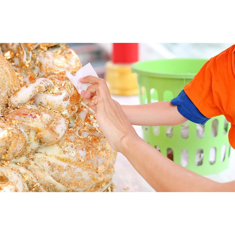 To use gold leaf: Avoid touching gold leaf with your hands or fingers as it will stick. Do not breath directly on gold leaf, it will blow away or wrinkle. Using a pair of knife, tweezers, or razor, cut away the portion of gold sheet that you wish to use. Pick up the piece of gold using just the tip of your knife or tool and gently touch the item you are applying the gold leaf to. It should stick as it applies very easily to surfaces.