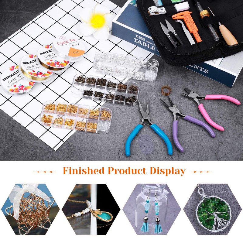 - INCLUDE ALL YOU NEED – Paxcoo jewelry making supplies kit includes 3 jewelry pliers, 3 rolls of jewelry wire in silver, gold and bronze, 1 roll of clear beading string cord, 1 roll of black waxed cord, 6 needles in different sizes, 1 tweezers, 1 caliper, 1 awl, 1 jump ring opener, 1 thimble ring, 1 thread scissors, 1 tape measure, 3 needle threaders, 1 zip pouch, 3 boxes of jewelry findings in different colors