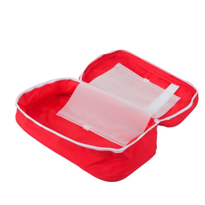 - Red Color and Letter Print: This red first aid bag has a letter print design and needs additional contents to be useful.