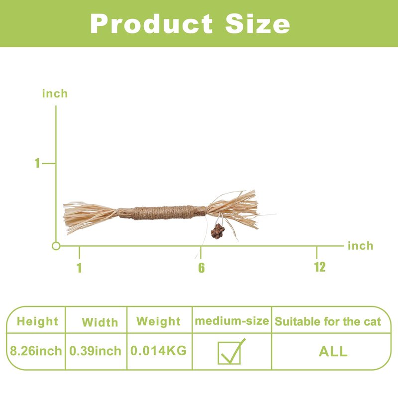 2 cat chewing sticks 1. Then the pet spends a beautiful day, natural and wild, unprocessed-Polygonum cuspidatum 100%, organic. No additives or preservatives, just like your pet. For gum protection, Polygonum multiflorum stick effectively removes dental plaque and calculus, eliminates bad breath, and protects the oral health of you and your pet. 2. Cat grinding rod, the material attracts cats to play with nature, raffia and vines are PAZ'S GIFT, which is filled with fruit to chew the fruit, and the hemp rope is fixed to make the toy more resistant to biting. 3. Better digestion, simple feeding method-catnip can promote intestinal peristalsis, improve digestion, and keep pets vigorous. Feed it directly to your cat or cut off the skin. After using for a period of time, in order to maintain the effect, the use layer needs to be cut off. 4. Cats, kittens and adults. Effectively ensure that your cat will like it. Your cat will be strongly attracted to chewing, rubbing, licking, rolling, running, purring and purring. It is very cute.