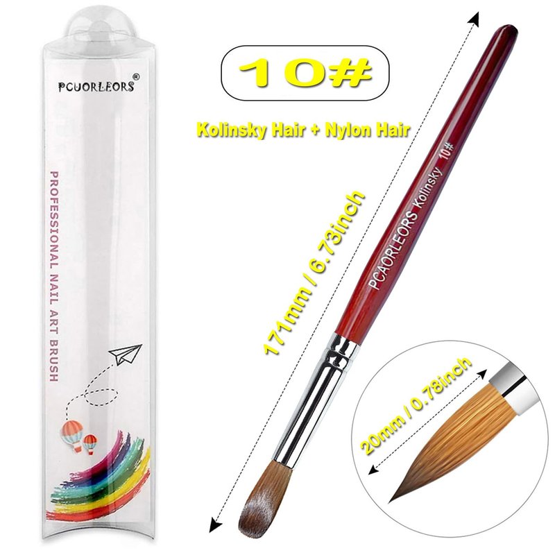 PCUORLEORS Acrylic Nail Brush with Pure Kolinsky Sable Hair and Red Wood Hand, Round/Flat Professional Gel Brush for Acrylic Power and Nail Extension Size #8,10,12 (#10)