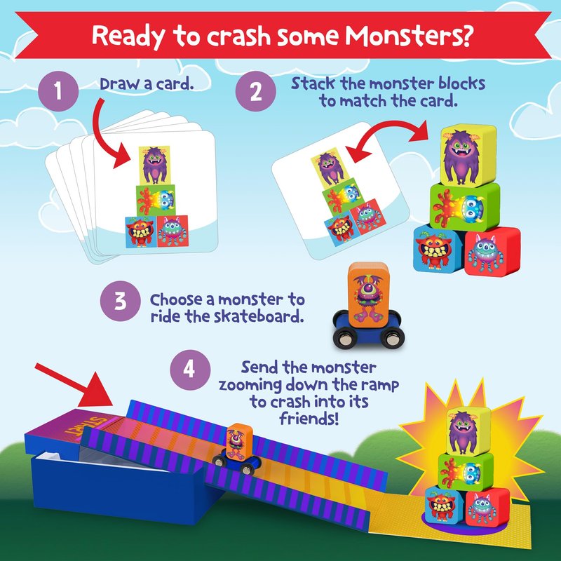 - This colorful toddler game includes 5 foam monster blocks, 30 cards, 1 skateboard, 1 ramp, 1 scorecard, instructions and parent guide