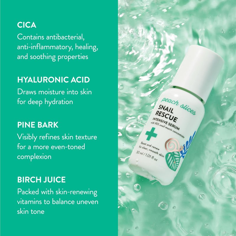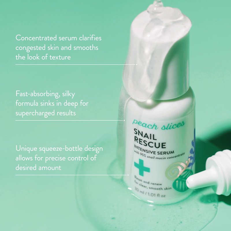 - Peach Slices Snail Rescue Intensive Serum is your fast track to hydrated, clear, smooth, and even-toned skin with 95% snail mucin and pine bark extract.