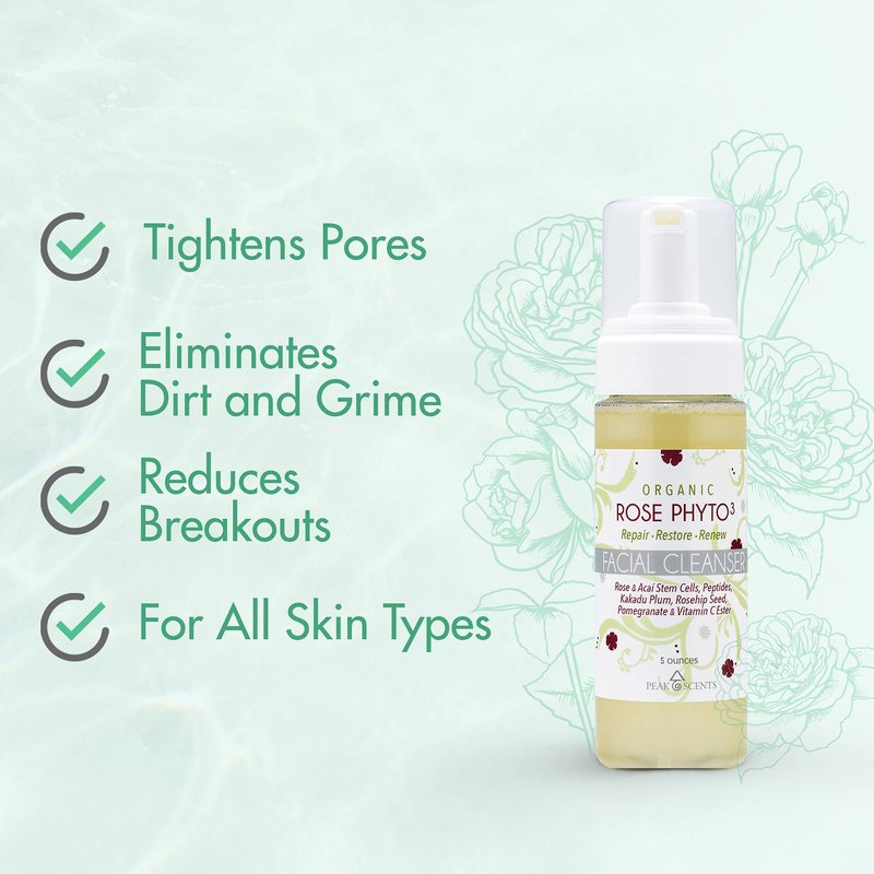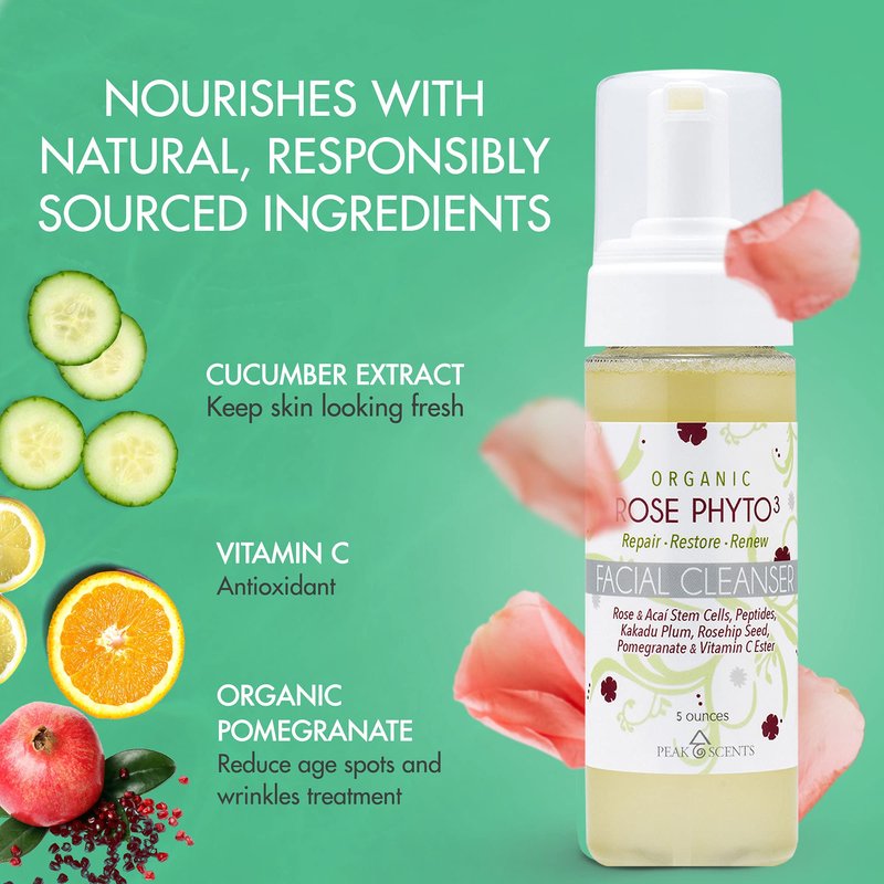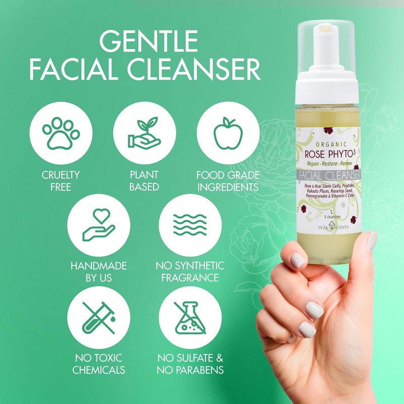 Peak Scents Gentle Organic Facial Cleanser - Natural Face Wash with Rose Phyto³ - Hydrating Gentle Cleanser, Ideal for Women - All Natural, Organic Face Wash - Sulfate Free Foam Wash (5 oz)