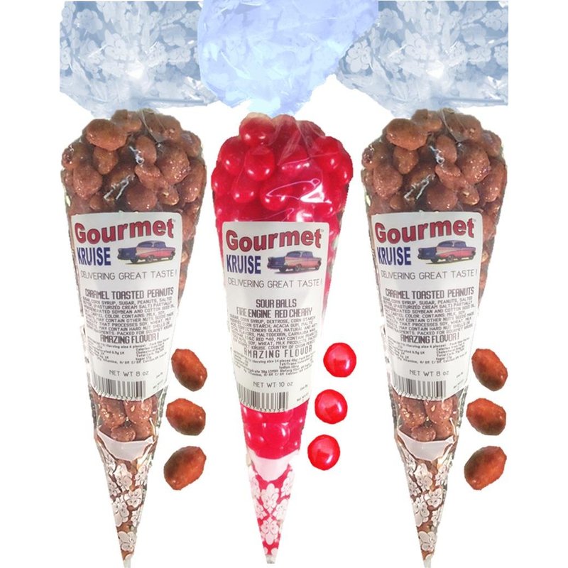 Peanuts (2) Caramel Toasted (1) Sour Cherry Balls Fire Engine Red (NET WT 26 OZ) Gourmet Kruise Signature Gift Bags