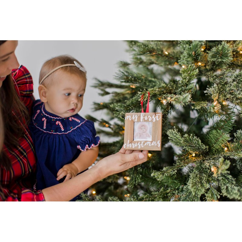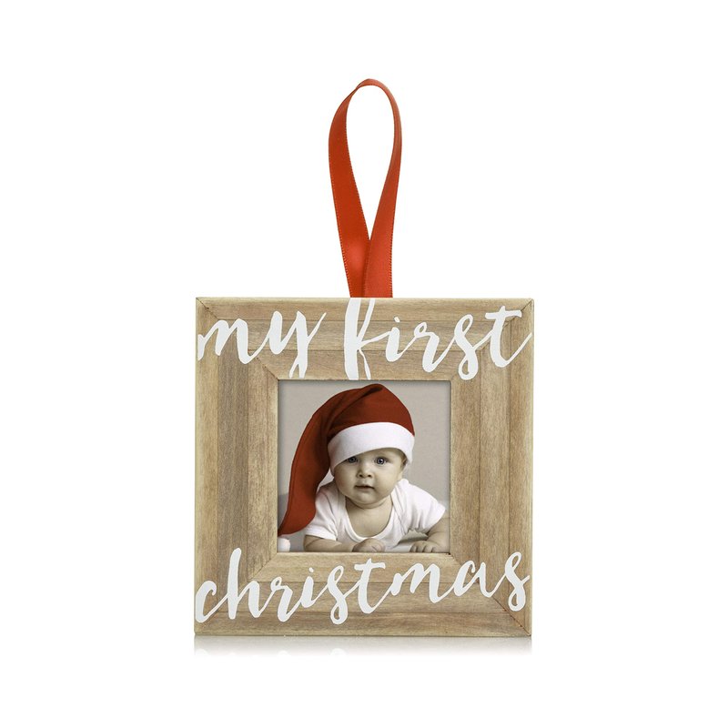 - This adorable wooden frame ornament with is painted in white with the script, "my First Christmas", making it match nearly any décor or tree decorating style