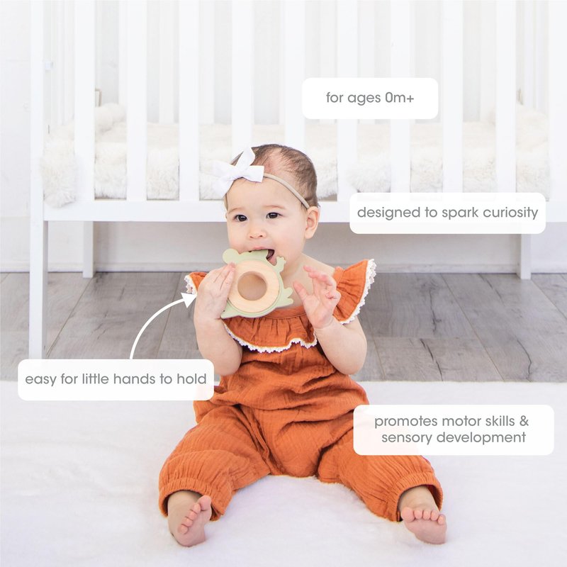 Pearhead Frog Wooden Baby Teether, Natural Wooden Teething Toy for Babies 0+ Months, Silicone Chewable Baby Teether, PVC-Free and Phthalate-Free, Safe and Gentle