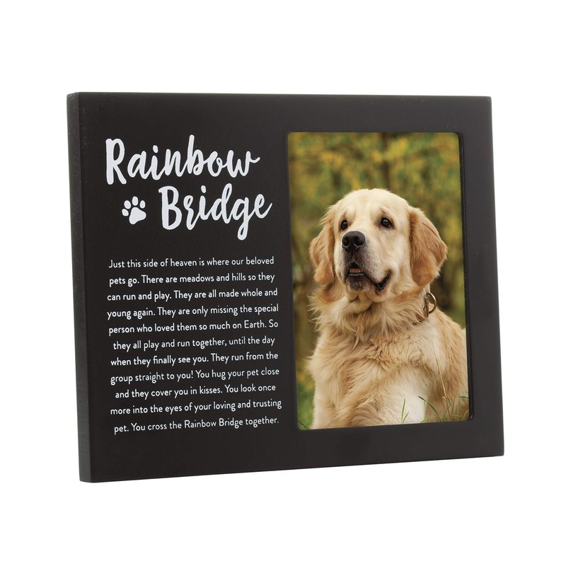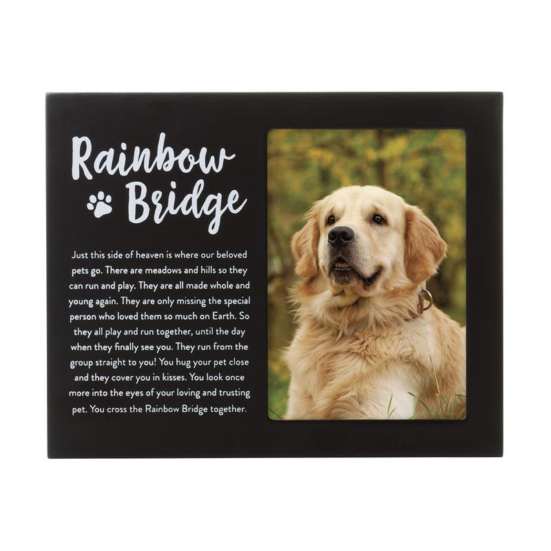 - Frame reads: “Just this side of heaven is where our beloved pets go. There are meadows and hills so they can run and play. They are all made whole and young again. They are only missing the special person who loved them so much on Earth. So they all play and run together, until the day when they finally see you. They run from the group straight to you! You hug your pet close and they cover you in kisses. You look once more into the eyes of your loving and trusting pet. You cross the Rainbow Bridge together.”