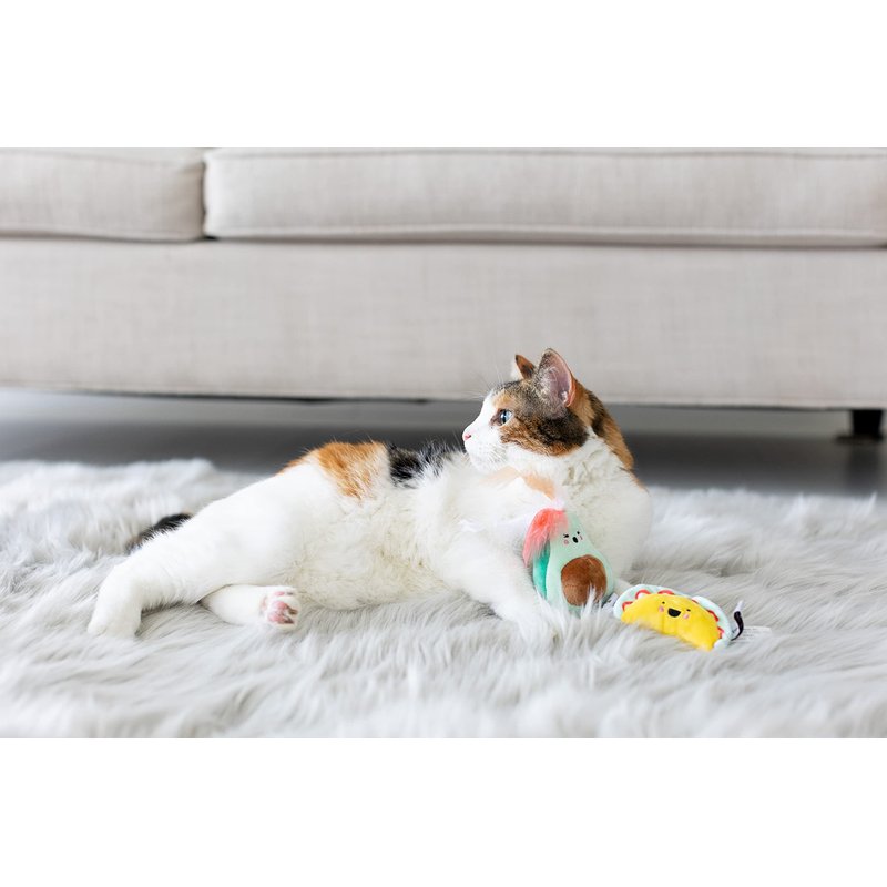 - Includes two plush cat toys with catnip: one crinkle taco and one feather avocado