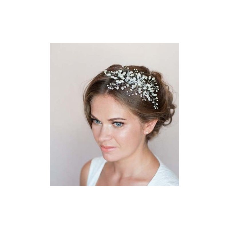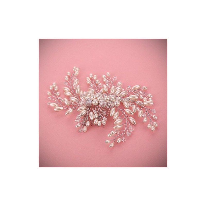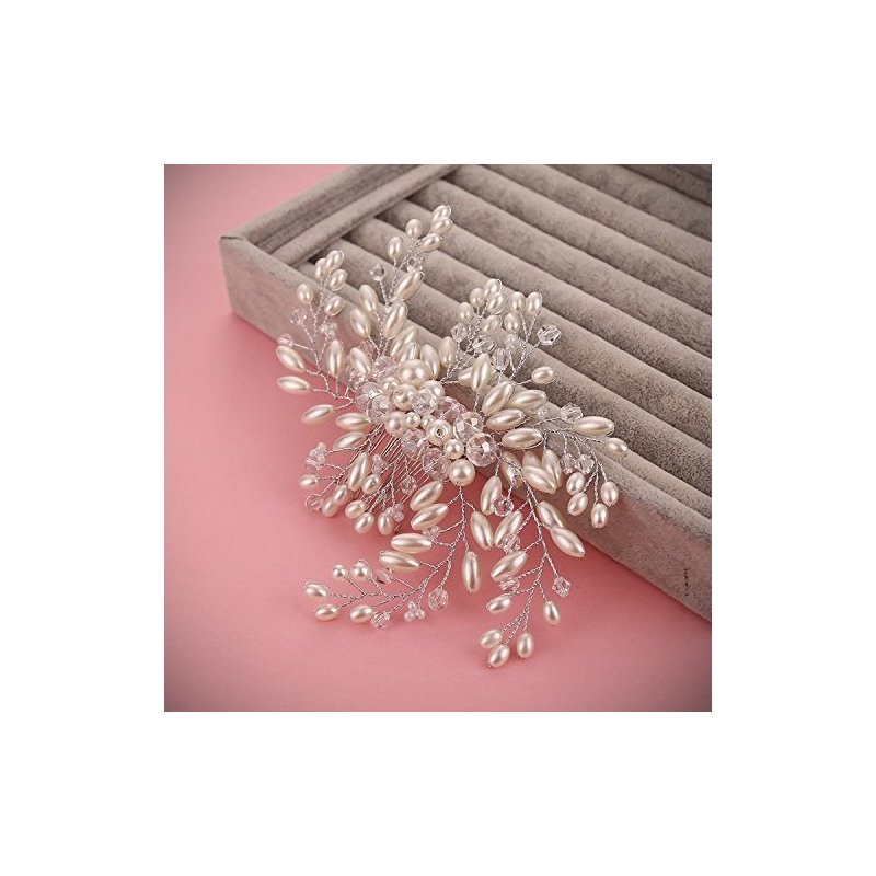 Bella's Hair Accessories specializes in beautiful bridal hair accessories. Beautiful Pearl and Rhinestone Bridal Hair Comb Crystal adorned metal twigs in sivler color Imitation pearls and crystals Hand wired twigs from silver jewelry wire It is adjustable and flexible to fit any hairstyle Attached to plastic comb