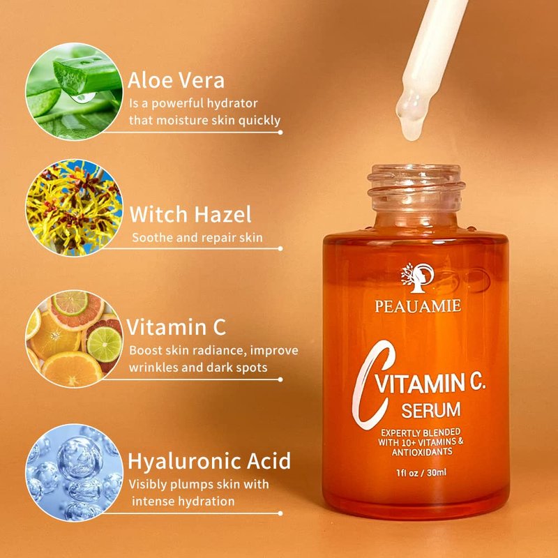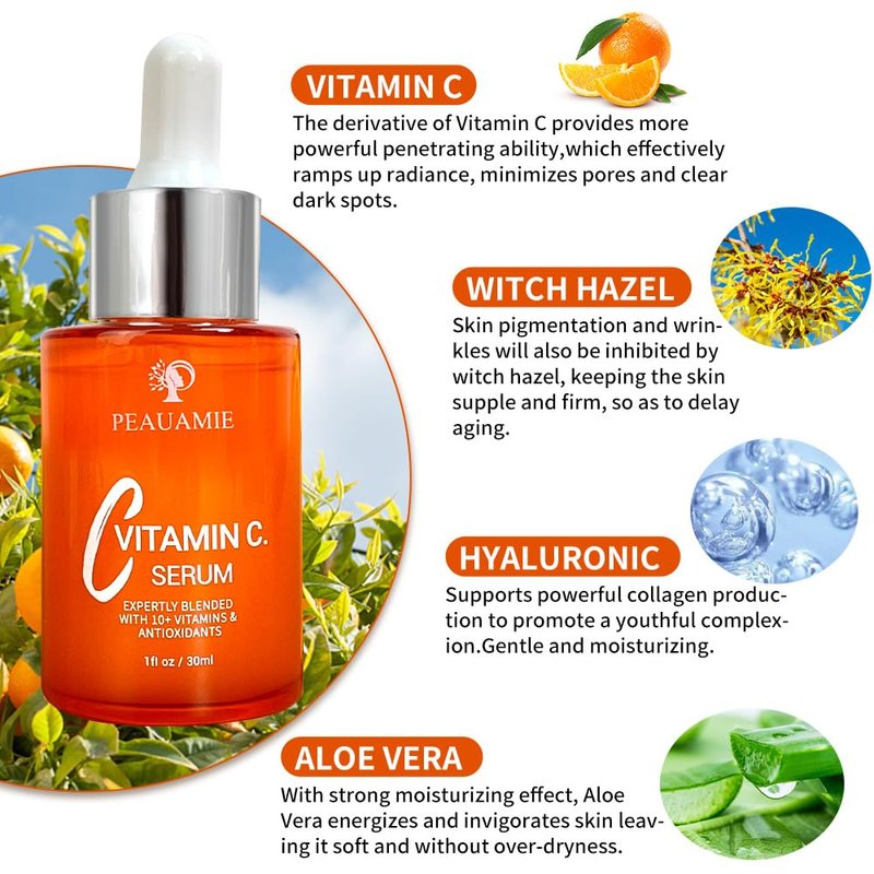 Peauamie Vitamin C Serum for Face Anti Aging Serum with 2% Hyaluronic Acid and 1% Retinol Ferulic Acid,Moisturizer Serum for Dark Spots, Fine Lines and Wrinkles 1 fl oz