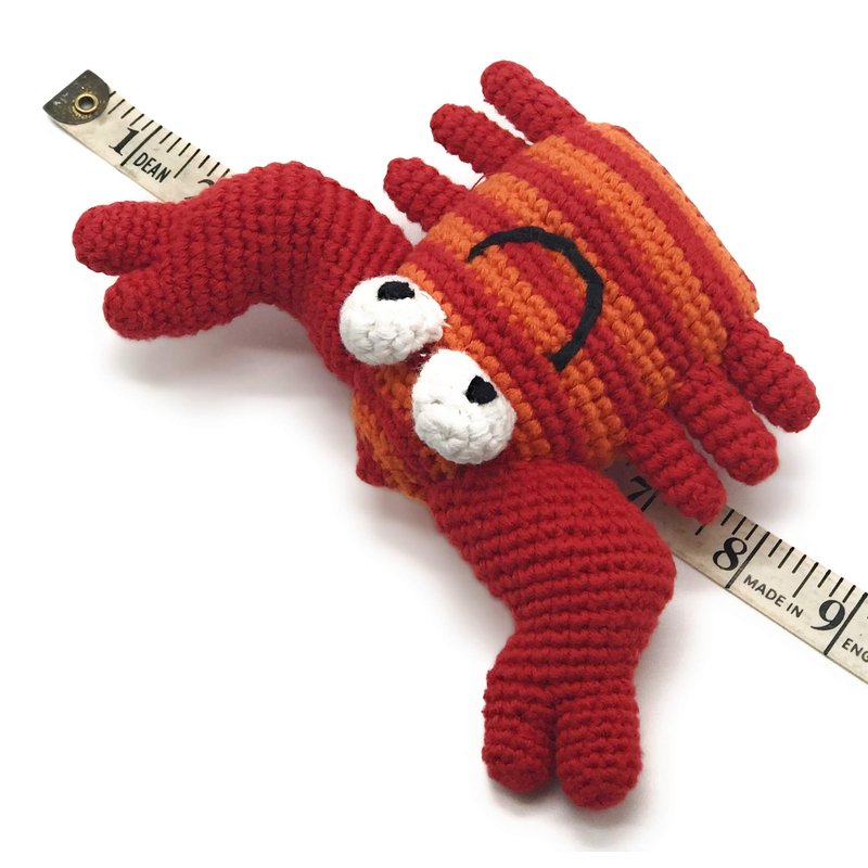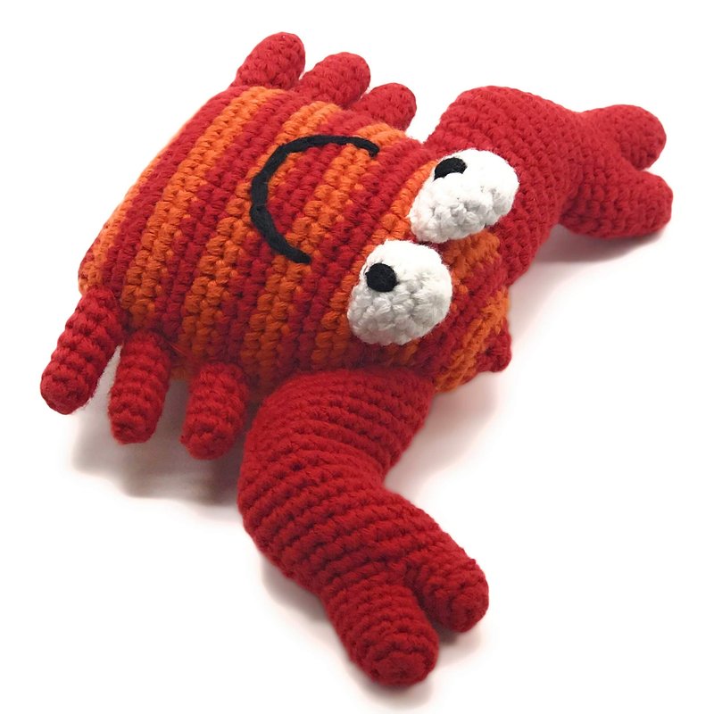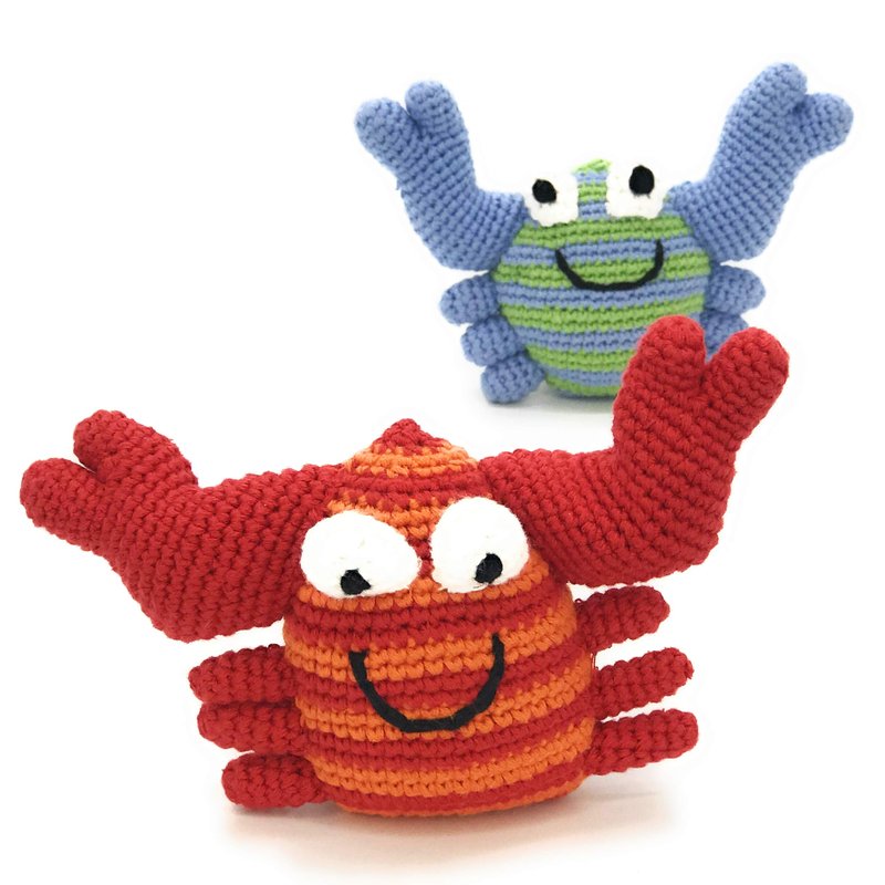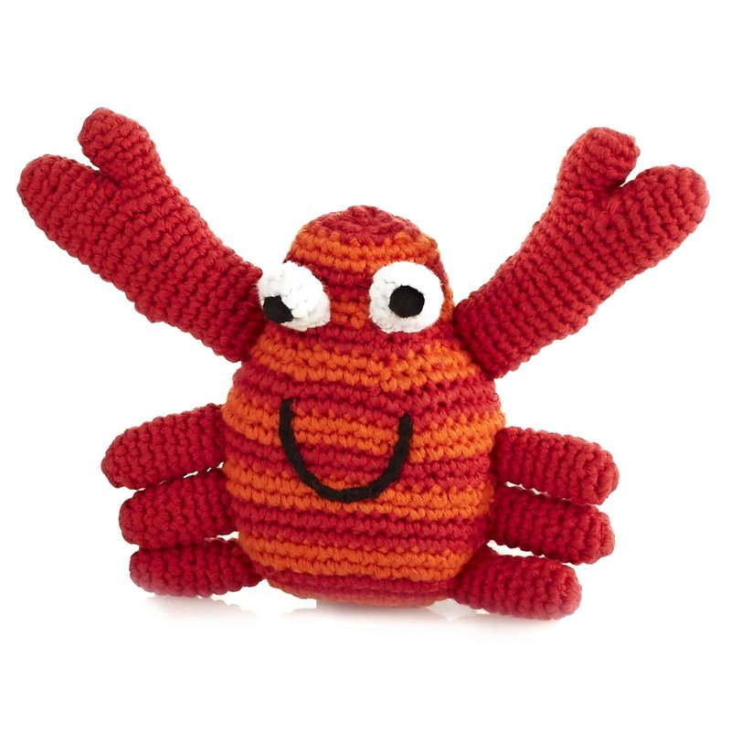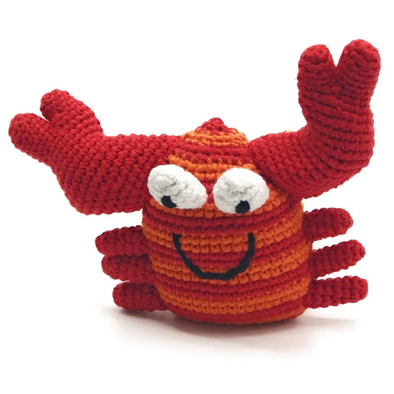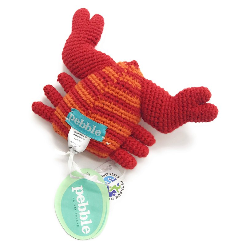 PEBBLE Red Crab Rattle— The body of this happy little crab is red and orange striped. Its claws and legs are solid red. Handcrafted with 100% cotton yarn, this red crab toy is soft and lightweight, perfect for little hands to grab a hold of. The rattle inside gives a soft sound when shaken. Perfect for ocean themed nurseries or a summer vacation road trip. Pebble— "Putting smiles on faces worldwide!"