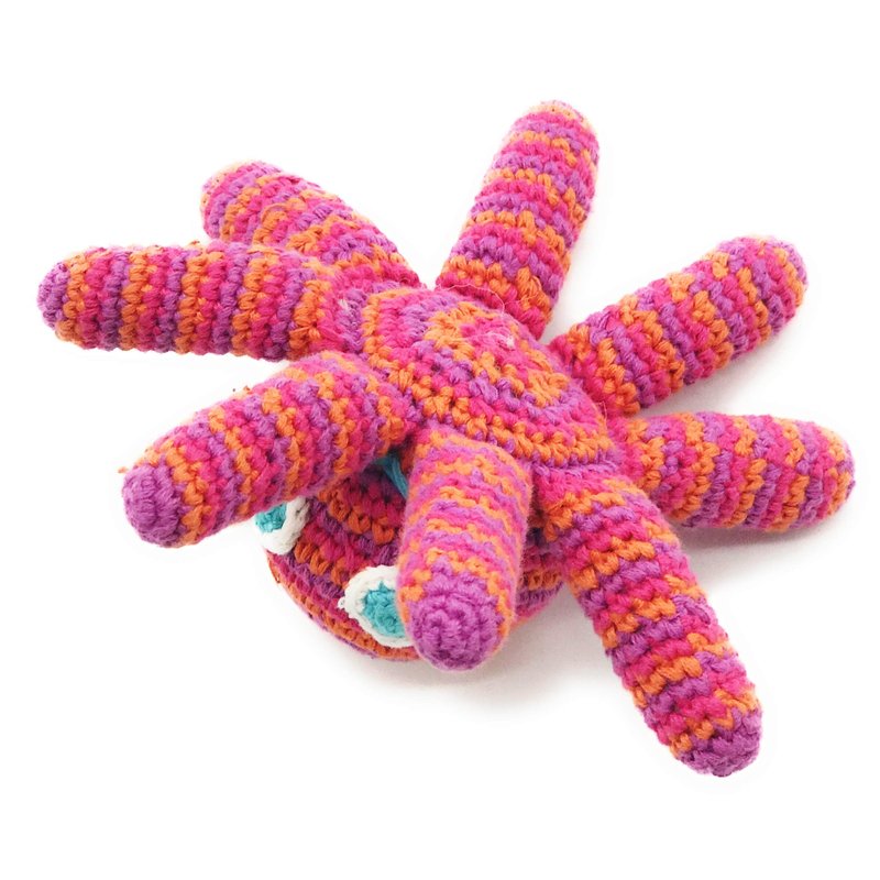 PEBBLE Pink Octopus Rattle— This friendly sea creature is ready to brighten your baby's day! It has bright pink, orange and lavender stripes, with turquoise eyes and and a smile that never stops. Its 8 tentacles are the perfect size for tiny hands to grab onto and the rattle inside gives a soft sound when shaken. Handmade with cotton yarn, it is super soft and lightweight. Perfect for a baby shower gift or a trip to the beach! Pebble— "Putting smiles on faces worldwide!"