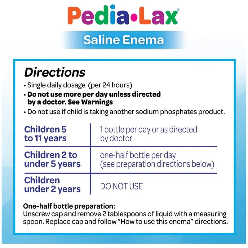 Pedia-Lax. Designed for children ages 2-11, Pedia-Lax Laxative Saline Enema helps provide fast, gentle relief from occasional constipation. The child-sized bottle is latex-free and has a soft, flexible lubricated comfort tip for ease of use. Pedia-Lax Laxative Saline Enemas are reliable, stimulant-free, and provide relief in 1-5 minutes. The saline solution increases water in the intestine to soften the stool and help produce a bowel movement. Pedia-Lax Laxative Saline Enemas are not for use in children under 2 years of age. Provides quick, gentle, and safe constipation relief Designed for kids ages 2-11 Gentle saline enima used in most hospitals Latex free Soft, flexible Comfortip