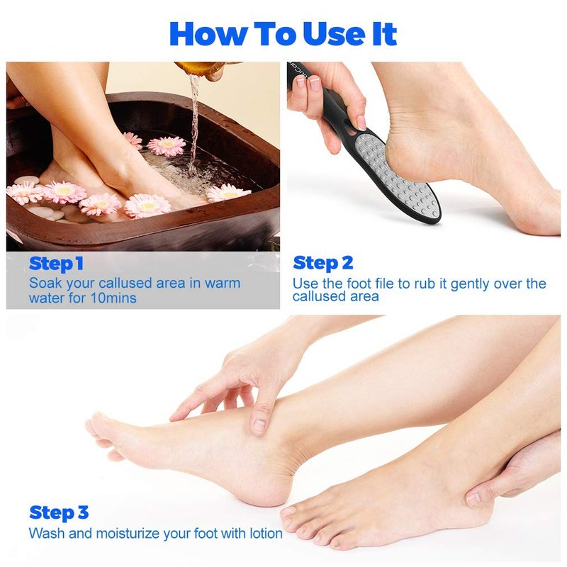 - 【Double-sided Stainless Steel RASP】First scrubbing your feet with coarse side to remove calluses and dead skin. Follow rub it with fine side to improve and tender the skin of feet. For better results, we recommend to soak your feet in warm water for 10mins to soften your skin before using.