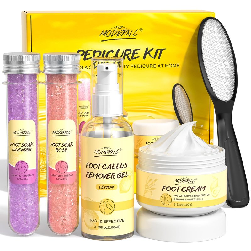 - PERFECT SET DESIGN: Carefully selected pedicure set brings you a salon-quality experience. Soak, exfoliate and moisturize your tired feet. Each kit includes 2 pcs of foot soak salt, foot callus remover gel, foot cream and foot rasp. It can help you relieve foot fatigue and make your feet smoother and softer.
