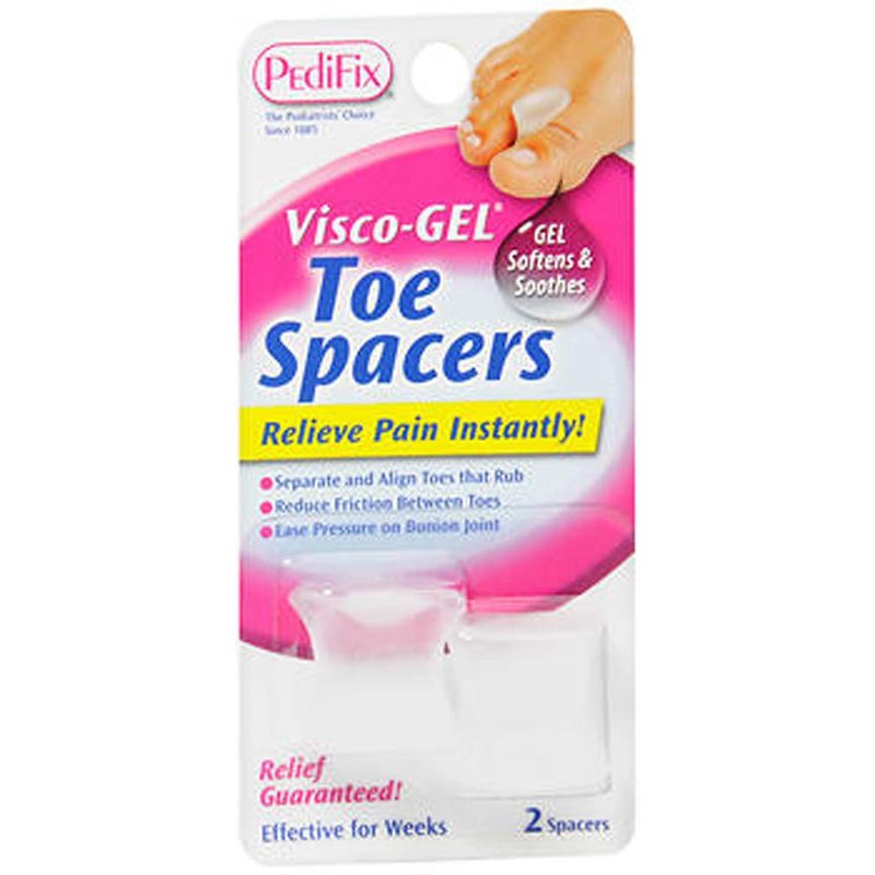 Soft Gel loop keeps PediFix Visco-GEL Stay-Put Toe Spacers in position between first and second toes to separate and align, and prevents rubbing and friction. Helps divide crooked toes and gently straighten the big toe to relieve pressure on bunions, too. Exclusive Gel releases mineral oil to soothe and hydrate skin. PediFix Visco-GEL Stay-Put Toe Spacers are interchangeable for left or right foot. Loop fits over 1st or 2nd toe. Washable. Reusable. Durable.