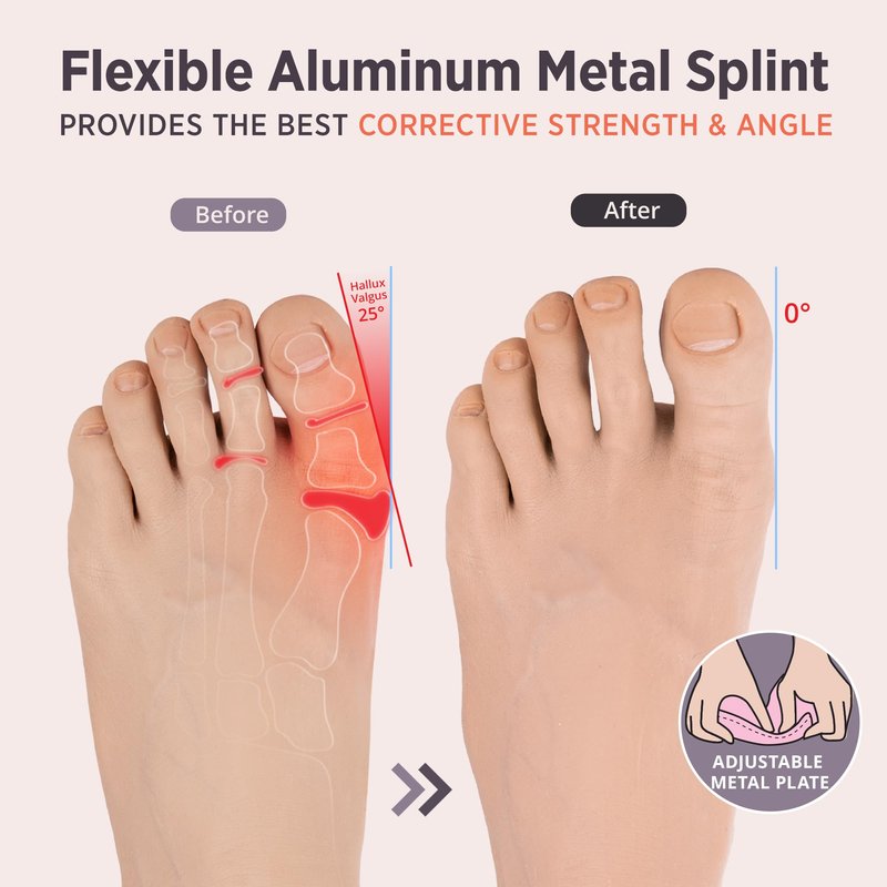 - RESTORE NATURAL ALIGNMENT: Without intervention or behavior changes, hallux valgus will worsen over time. Our toe bunion corrector kit is designed to help. It provides protection and support using a flexible aluminum brace that applies gentle and constant pressure to realign your big toe, slowing the progression or formation of bunions.