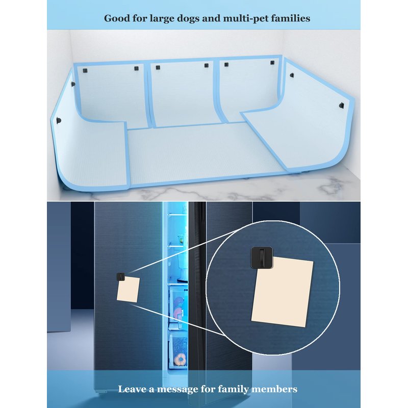 1.Why do you need Pee Pad Holder? - What if the dog lifts his leg and pees on the wall? It's a natural phenomenon for dogs to mark their territory by peeing. So don't worry! Dog pee pad holder will help you to attach pee pads on the wall in potty training. It won't slip, strong enough to secure the dog pads in place, yet easy to stick & release. Can hold any size dog pee pads! 2.Why Choose Our Dog Pad Holder? - Our potty pad holder of the magnet is more powerful, the pad won't slip off. Other potty pad holder has weaker magnetic forces, if the dogs play on the pee pad. Our dog pad holder uses buckle type structure to hold the magnet, the magnet does not shift and will not emit abnormal sound. Other dog pad holder of the magnet will fall off over time and make a strange sound. 3.What Are the Benefits of Using It? –No need to get mad because of the dog lift his leg and make a pee mark on the wall. No more cleaning pee pad holder tray in addition to the mess your dog has made. No need to buy expensive adhesive dog pads. No need to spend more time cleaning pads. 4.How To Use It? - Choose a potty training area and stick the base of the pee pad holder on the wall, then secure pee pad with the magnet cover, easy to lock and release. Tips: adhesive is suitable for sticking on smooth and flat walls, such as wooden walls/tile walls/marble walls/glass walls and so on. 5.In what scenarios is it used? - 2-3 dogs or cats? No problem! XL dogs with large training area? Yes! Perfect for both disposable pee pads and washable pee pads (reusable puppy pee pads).