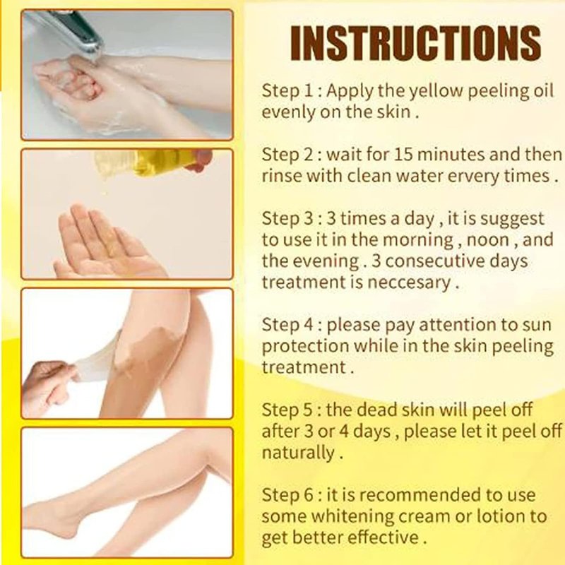 - Easy to Use --- On clean and dry skin, use a cotton swab to apply a thin, even layer of yellow exfoliating oil to the face or body, and wait for 15 minutes and then rinse it. Three times a day. Apply yellow peeling oil on only a section of your body. For example, only the arms and neck. Apply peeling oil over 3 days and rinse with only water until it starts peeling.
