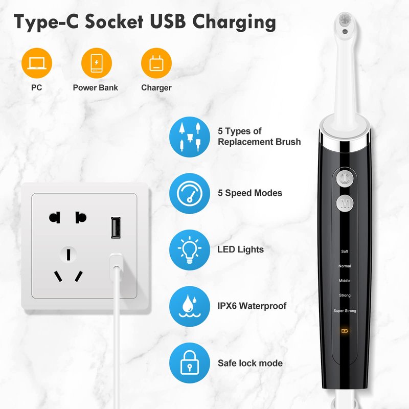 - USB Charging & IPX6 Waterproof: The professional electric tooth polisher is equipped with a Type-C charging port, which can be charged by power bank or PC. The shell of the machine is IPX6 waterproof which allows the head to be washed with running water. The body can be wiped with a damp cloth, but do not soak in water. The box is convenient for storage and easy to carry when traveling.