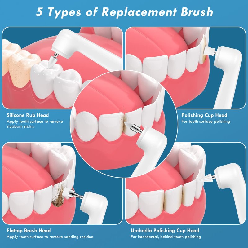 - 5 Brush Heads: Additional replacement heads from the same brand can be purchased. The teeth polishing set comes with 5 different types of brush heads. The silicone rub head removes stubborn stains; the flattop brush head and the pointed brush head removes residual grit; the polishing cup head and the umbrella polishing cup head polish teeth surface, perfect for daily cleaning, whitening and polishing of teeth.