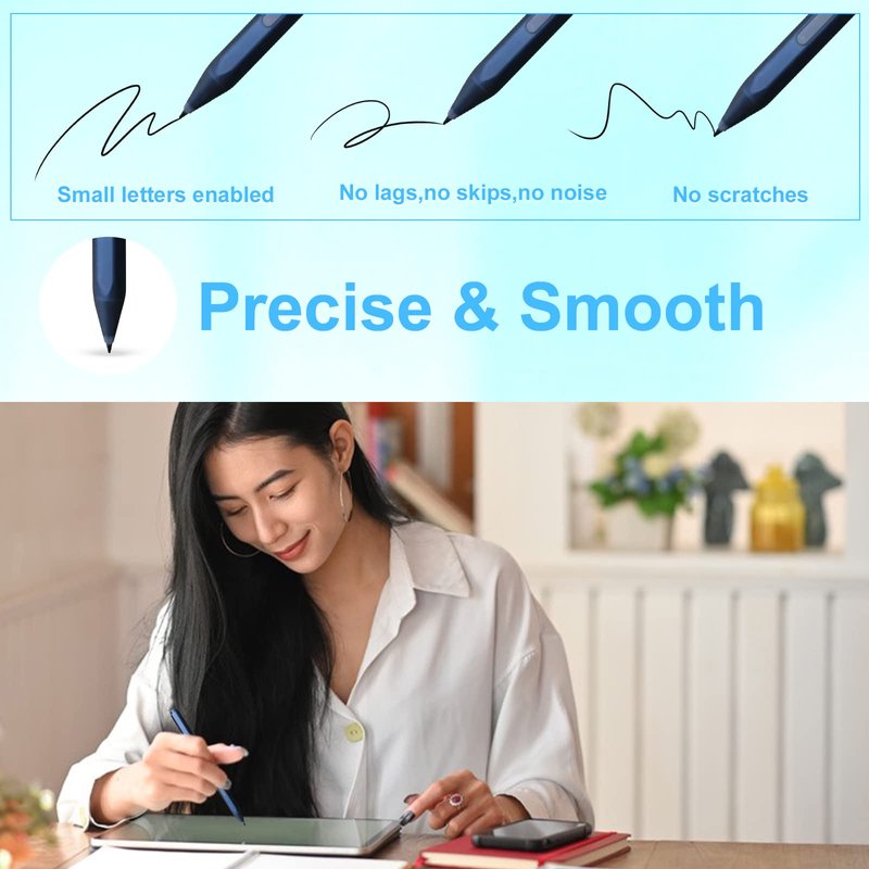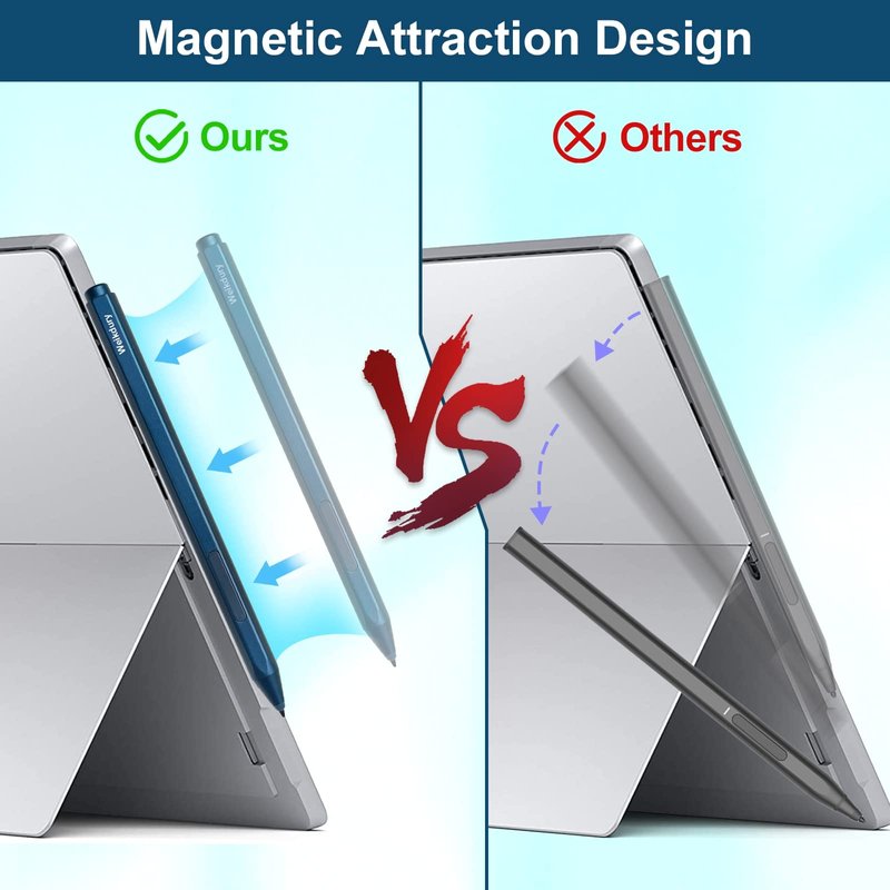 - 【Palm Rejection & Magnetic Adsorption】 Let your palm naturally on the screen. No need to worry about marks, writing or painting without interference. The stylus pen built in magnetic adsorption design, which makes it easy magnetically attach to your tablet. And the pen for surface also has the function of right click and eraser click button.
