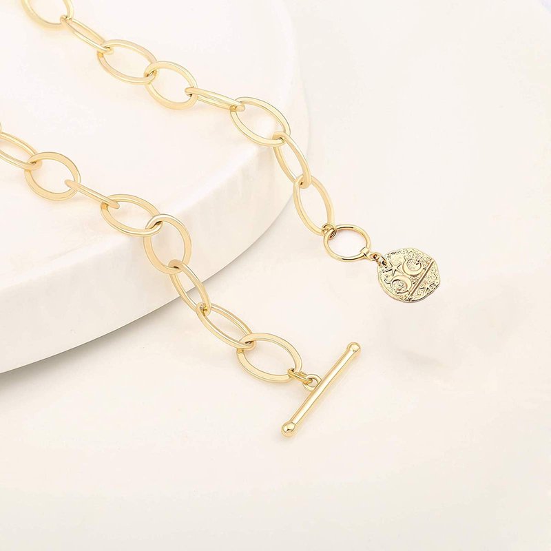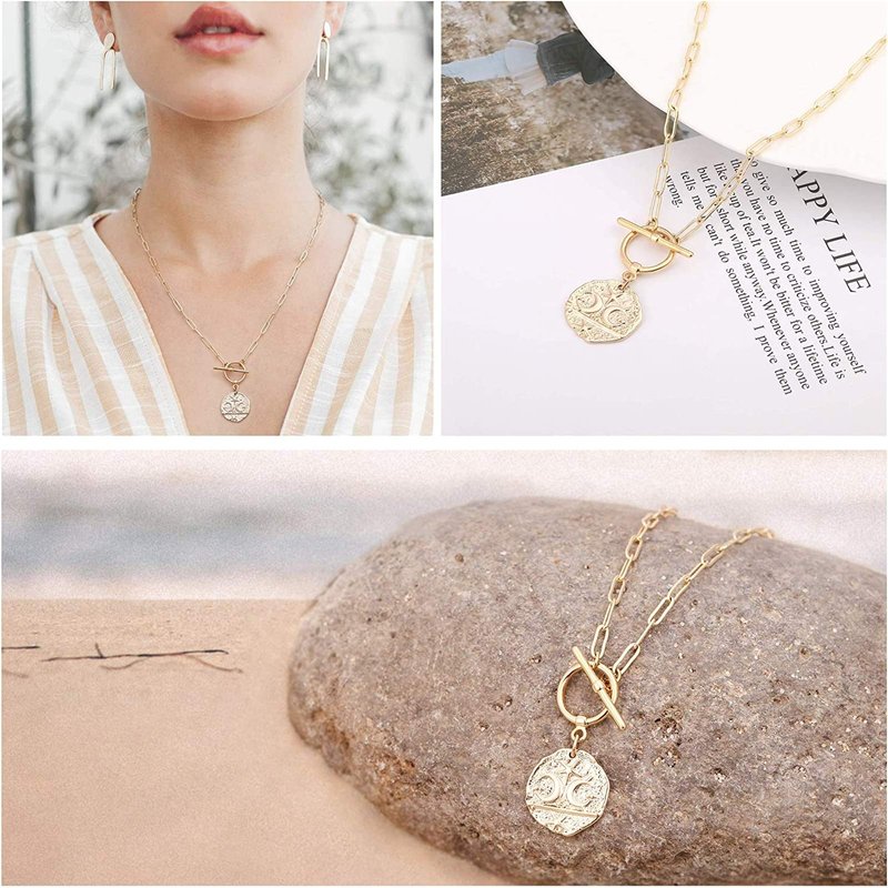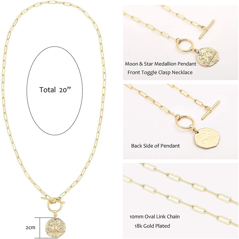- A paper clip necklace that is made completely with high-quality 18k gold filled materials. Stunning coin charm pendant on a delicate 14mm oval link chain and delicate rolo chain, very stylish and elegant, will take everyone's breath away.