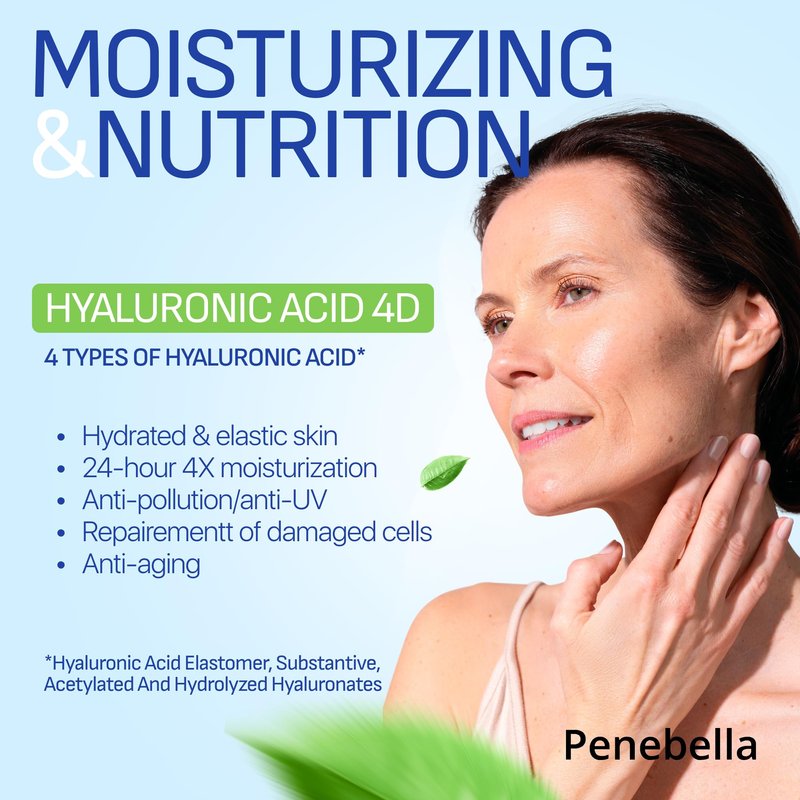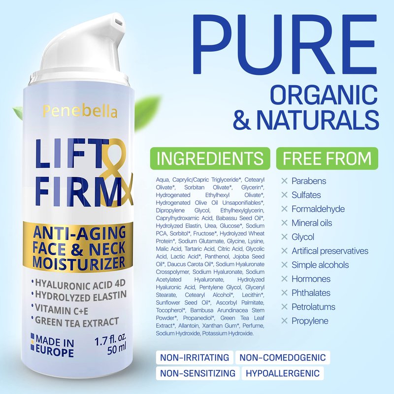 PENEBELLA Face & Neck Firming and Tightening - Hyaluronic Acid 4D, Vitamin C+E, Elastin - Made in Europe - Lift & Firm Neck Cream - Face Moisturizer Anti Aging Treatment for All Skin