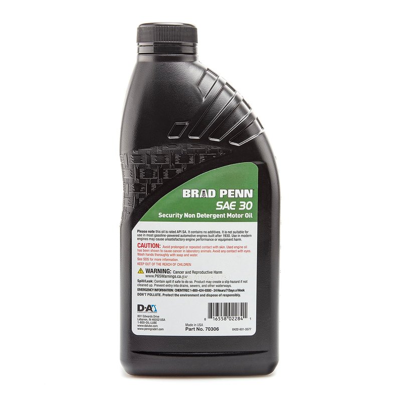D-A Brad Penn Security Non Detergent Motor Oil is a SAE 30 uninhibited oil formulated with high quality base stocks and anti-foam to minimize cavitation. The base stock is refined from PennGrade base oil, which is a unique, thermally stable paraffinic crude that is free of asphalt constituents, has a naturally high viscosity index, and contains only trace amounts of sulfur and nitrogen. PennGrade base oil offers naturally good anti-wear characteristics making this oil suitable for use in certain hydraulic applications where an ISO viscosity grade (VG) 100 fluid is warranted, straight cut reduction gear applications where bearing protection is crucial, and other applications requiring an API Service SA fluid. Category SA denotes service typical of older engines operated under such mild conditions that the protection afforded by compounded oils is not required. This category has no performance requirements, and oils in this category should not be used in any engine unless specifically recommended by the equipment manufacturer.