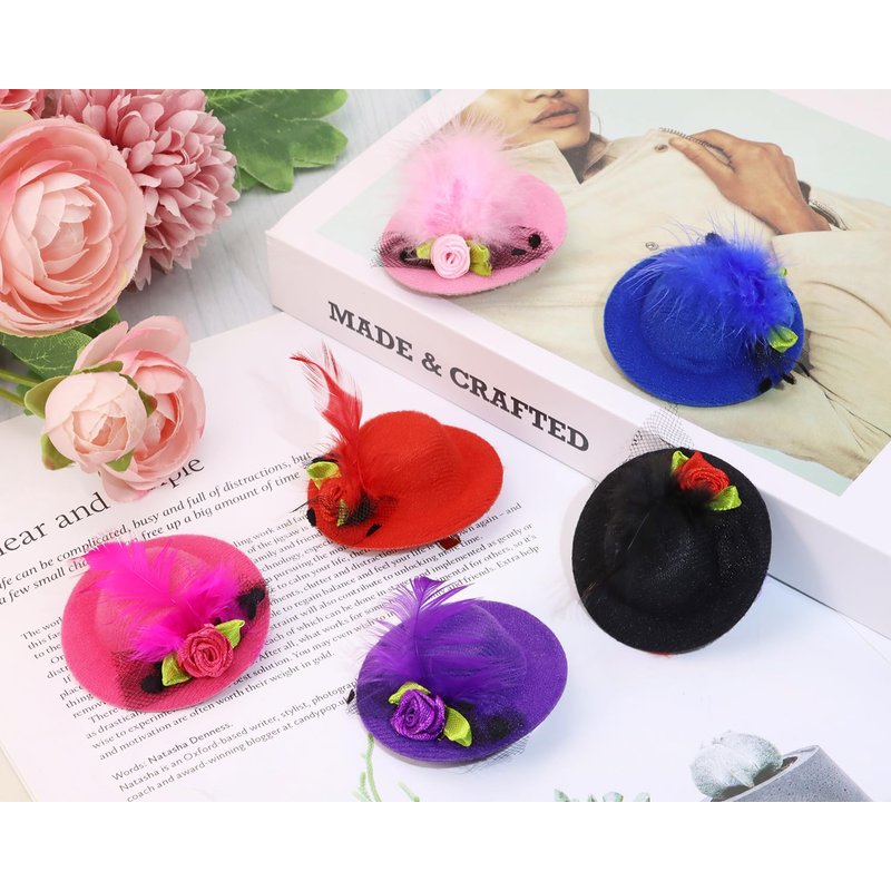 - Mini hat hair clips made of quality coarse cotton and stainless steel alligator with ribbon rose flower faux feather ornament