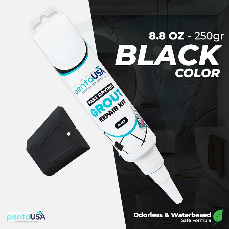PentaUSA Tile Grout Repairs Renews - 8.8 oz Black Grout Filler Tube, Fast Drying Grout Repair Kit - Restore and Renew Grouts, Scraper Included (8.8 Oz - 250gr - Black Color)