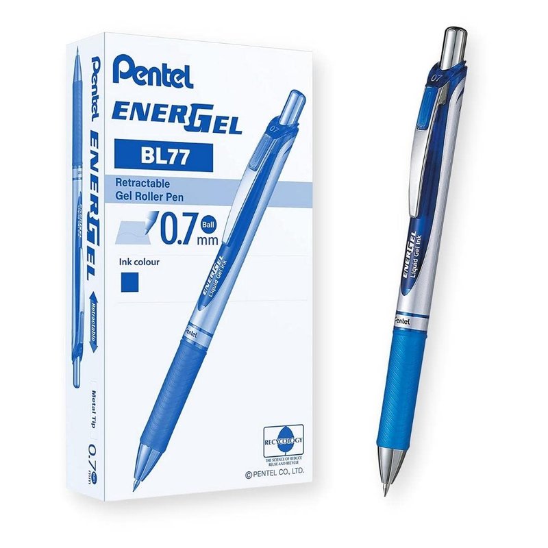 Pentel Gel Ink Pen, EnerGel RTX Gel Pens, 0.7 mm Metal Tip, Black/Silver Barrel, Blue Ink, 12 Each (BL77-C)