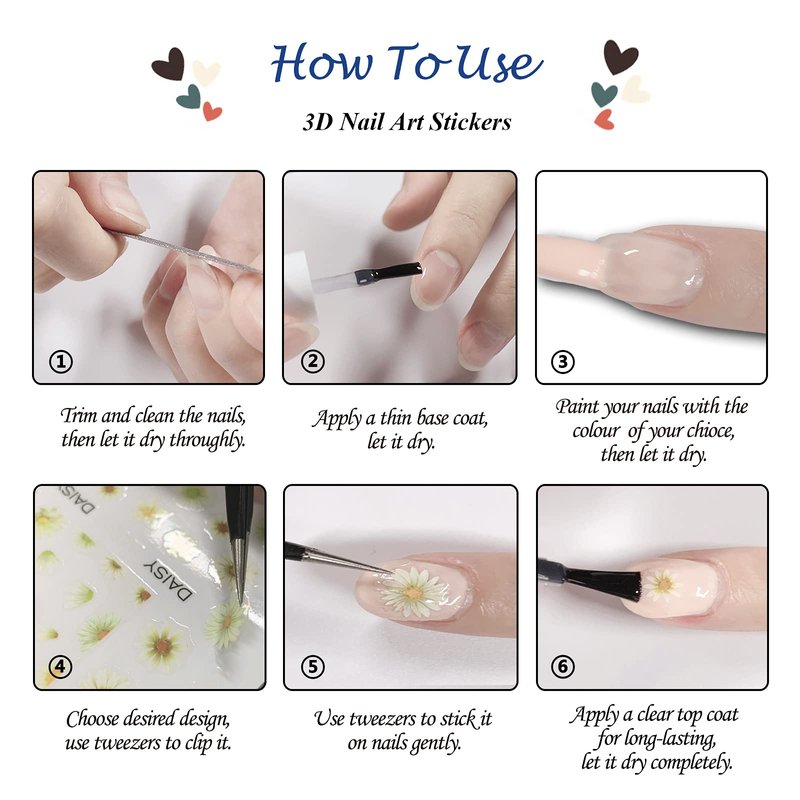 - ♦️【Easy to Use】:Self-adhesive design makes it stick well on your nail easier, and fits most natural or false nail, Choose the desired patterns, apply a thin clear base coat or a white polish, then use tweezers to peel it off to stick gently on your nail, You can also use top coat to cover to make the beautiful stickers long-lasting.