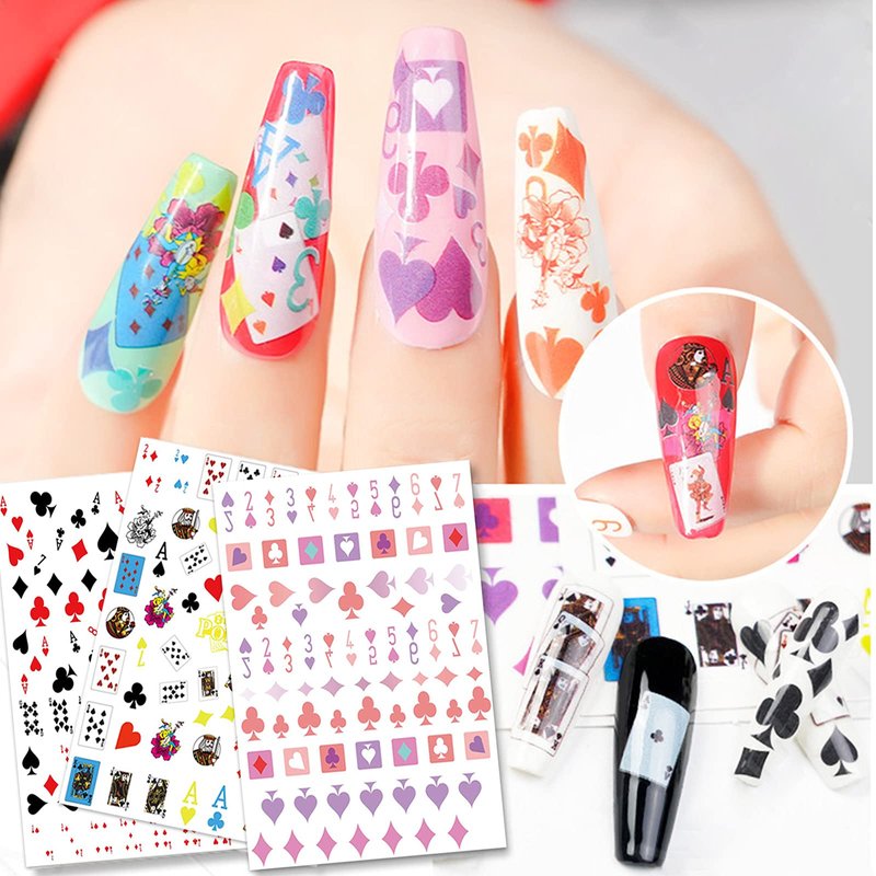- ♠️【Package Content】:Come with 10 sheets playing card style nail art decals. Each sticker is individually patterns, such as geometric heart, number, letters, graphics and so on.