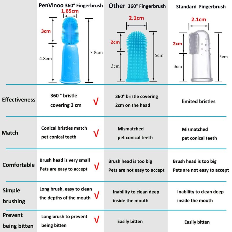 - 360º DESIGN - Patented design,360 ° silicone fingerbrush, soft and comfortable,pet mouth is conical, conical bristle fits perfectly with pet mouth,brush head is very small, Pets are easy to accept. This finger brush is 2.7cm longer than the traditional finger brush, it is easy to clean the deep part of pet's mouth, and it can prevent fingers from being bitten by pets.