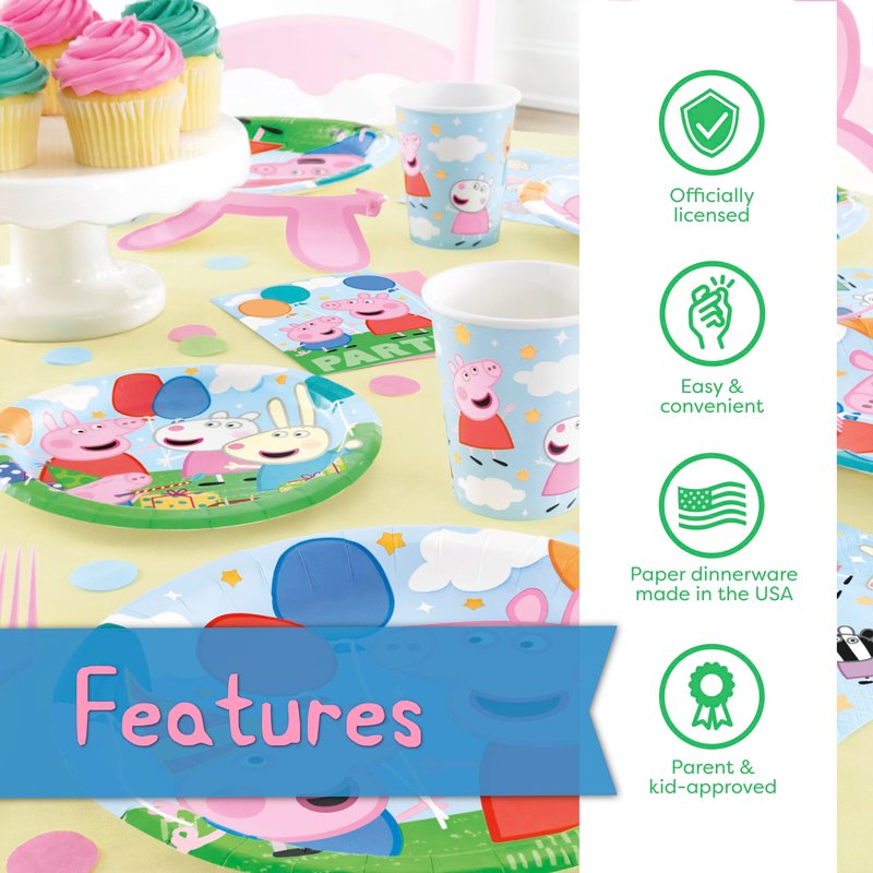 Join Peppa Pig and George in throwing the Peppa Pig birthday party they'll always remember. This Peppa Pig birthday party supplies kit contains everything you need for easy, fast setup and takedown. Peppa Pig party supplies pack includes more than just disposable dinnerware--it also has festive decorations perfect for tying the room together.