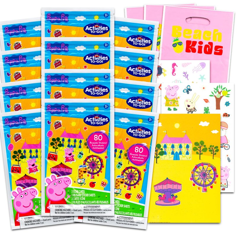 Peppa Pig Play Pack Grab & Go Party Favors Set ~ Bundle with 12 Peppa Pig Play Packs with Activity Sheets and Stickers (Peppa Pig Activity Books). Each resealable pack contains activity cards and reusable stickers. Hours of fun for any Peppa fan, perfect for travel, family gatherings, stocking stuffers, party favors, go packs, birthdays and more. Perfect as Peppa Pig party supplies, party favors, class parties, travel kits, go packs or just for fun. Sure to be a hit with any Peppa Pig fan. Officially licensed Peppa Pig products and merchandise. Also comes with bonus Beach Kids loot bags.