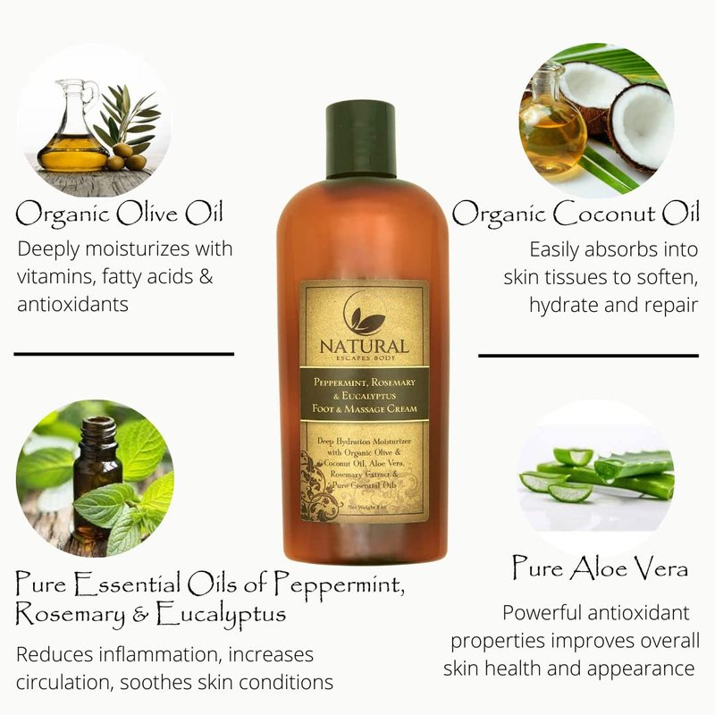 - POWERFUL FOOT CREAM: Deeply nourish and repair extra dry, tired skin with Peppermint, Rosemary & Eucalyptus Foot & Massage Cream. Made with botanicals, skin-loving oils and pure essential oils, this plant-based formula replenishes and moisturizes skin for long lasting hydration. Specifically created with premium hydration in mind, this foot repair cream locks-in moisture to keep feet looking healthy, smooth and crack-free – all year round!