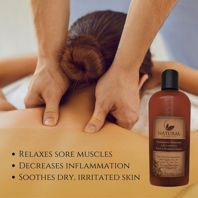 - THERAPEUTIC MASSAGE LOTION: All-natural massage cream is designed for long-lasting moisture! Pure essential oils of peppermint, rosemary and eucalyptus relax sore and tired muscles and increase blood circulation. Skin loving ingredients soften, smooth and deeply hydrate skin.