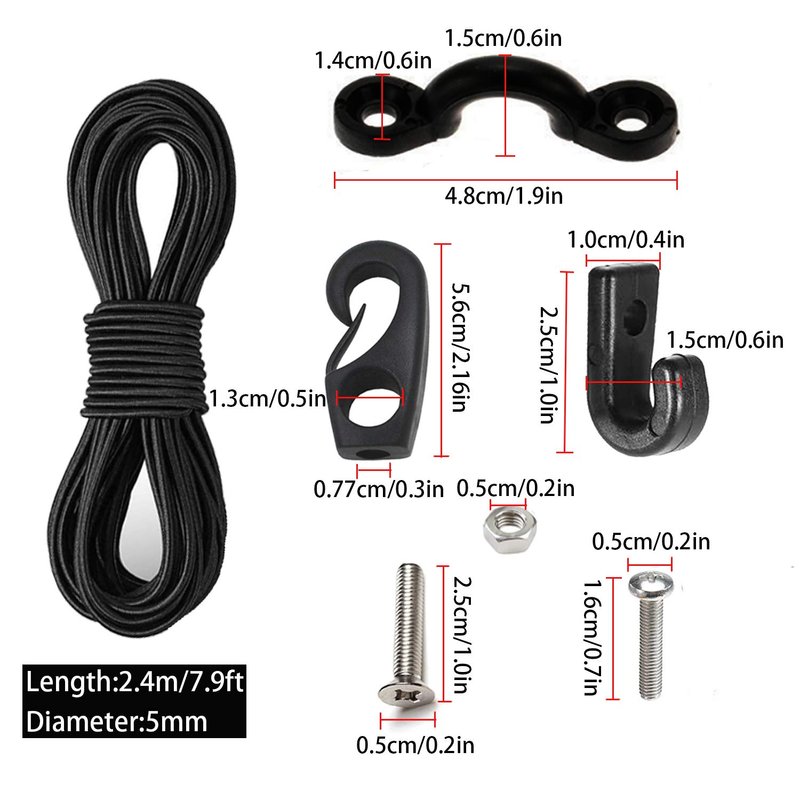 - PACKAGE INCLUDED:1/4 inch elastic bungee cord.8 feet,6 pcs nylon pad eyes and 13 stainless steel screws,2 pcs J hooks and 2 Pcs screws,2 Bungee Cord Ends.