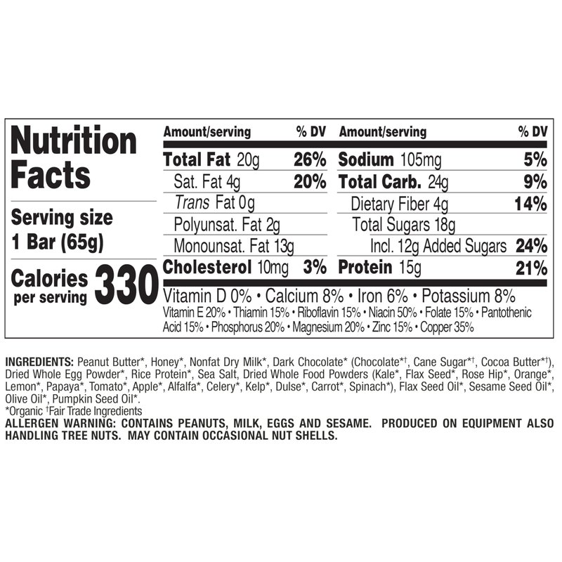 - DARK CHOCOLATE CHIP PEANUT BUTTER PROTEIN BAR: Enjoy wholesome ingredients like ground organic peanut butter, organic honey, dark chocolate chips, and a touch of sea salt. Satisfy your cravings and recharge your muscles with 15g of whole food protein, 20+ superfoods, and a delicious cookie dough texture. (packaging may vary)