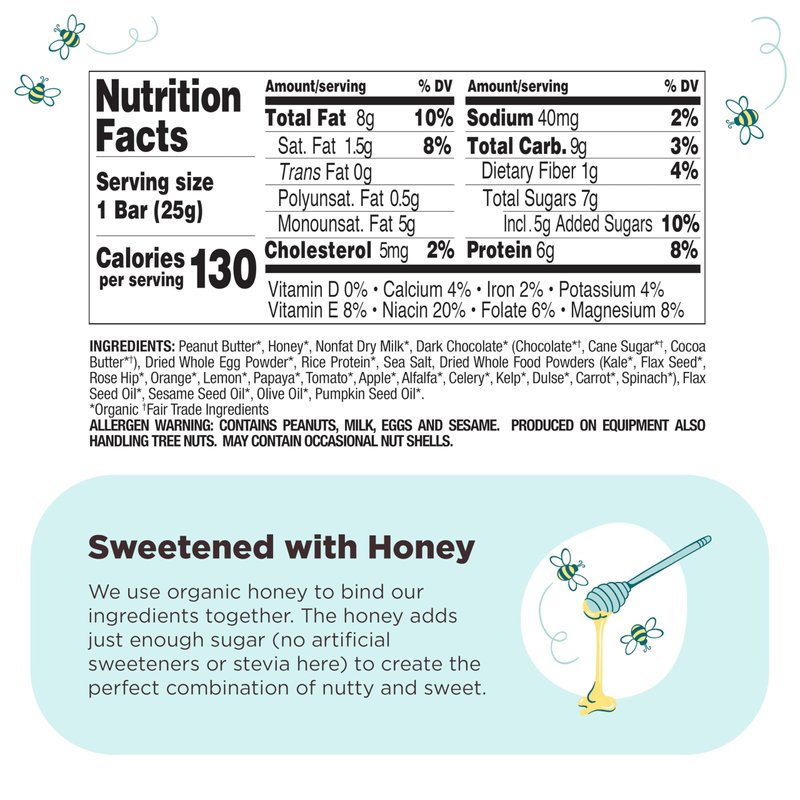 - PERFECT BAR MINI DARK CHOCOLATE CHIP PEANUT BUTTER PROTEIN BAR: Eight .88-oz organic protein bars with freshly ground peanut butter, honey, dark chocolate chips, sea salt, a satisfying cookie dough texture, whole food protein, and 20+ superfoods