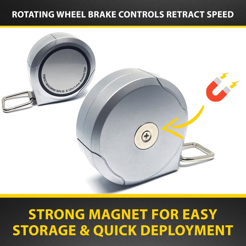 - MAGNETIC, REFLECTIVE AND RETRACTABLE TAPE MEASURE Reflective, aluminum rotating wheel brake allows for high visibility and effortless retract control. Strong magnet on case for affixing to metal objects.