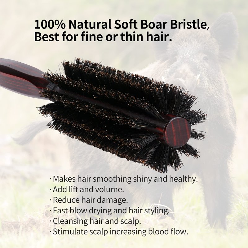 - 100% Boar Bristle Round Brush, It slides gently through hair without getting stuck, tangled, naturally remove impurities, reduce frizz and distribute hair's sebum to lubricate each hair strand, leave your hair silky, shiny and smooth.
