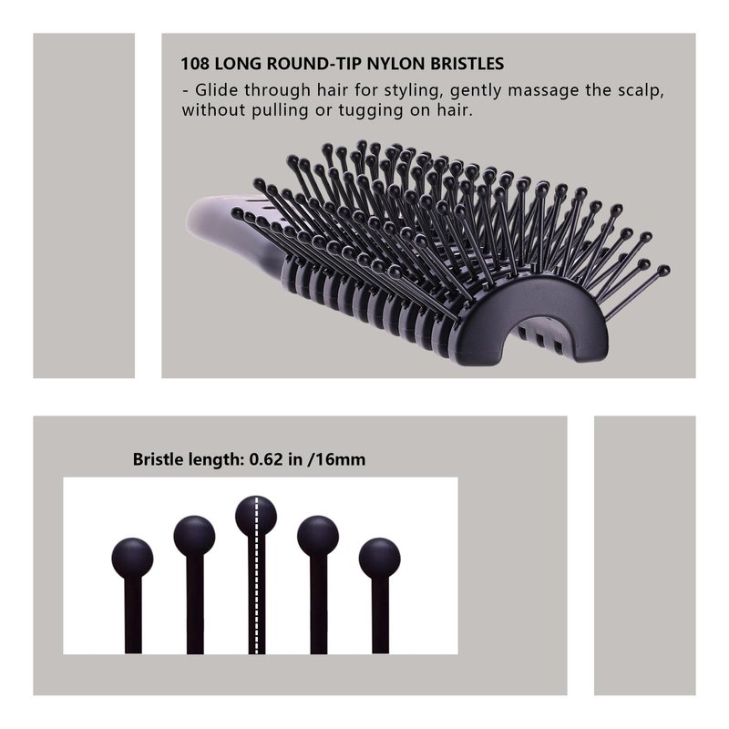 - EFFECTIVE FOR DETANGLING: Easily detangle wet or damp hair with our vented brush. The 108 long 0.62-inch round-tip nylon bristles glide smoothly through your hair, gently massaging the scalp without pulling or tugging. These anti-static and heat resistant bristles ensure a smooth and tangle-free styling experience, reducing frizz and damage.