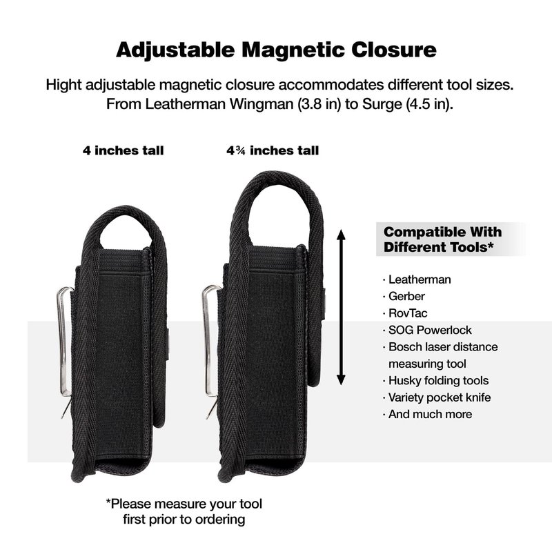 - ⛺ HEIGHT ADJUSTABLE: Easily adjust cover to fit tool from 4 inch to 4.75 inch tall folded. Compatible with Leatherman Wingman, Wave, Charge, Surge, Skeletool, Super Tool and other brands like Victorinox Swiss Army, RoverTac, Gerber. Please check model and sizes prior to order.