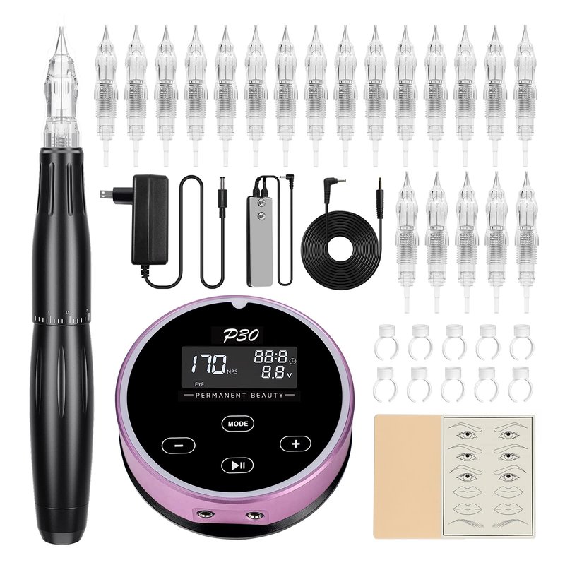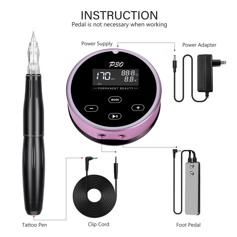 - 【What You Will Get】1 P30 permanent makeup tattoo machine , LW002 TATTOO MACHINE PEN, 20 pieces BIOMASER UNIQUE cartridge needles, practice skin, 10 pcs ink cup, power supply