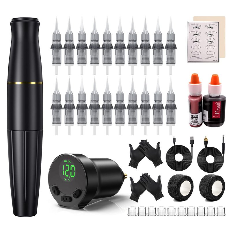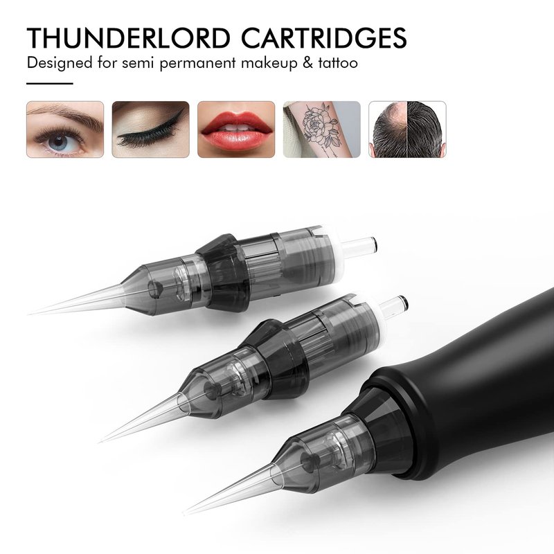 - 【WHAT WILL YOU GET】This permanent makeup tattoo machine kit comes with rotary permanent makeup tattoo pen, 20pcs Thunder lord cartridge needles Designed for MICROBLADING and TATTOOING, 2 gloves, 2 practice skin and 2 bottle of permanent makeup tattoo ink.